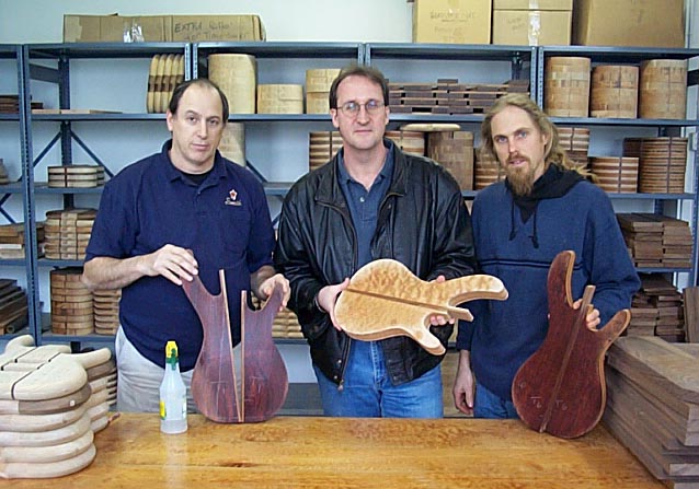 (left to right) Ken Smith, John J. Slog, & Jeffrey Schloeder from Guitar Villa in Bethlehem, PA They came up to the Factory to pick out some Exotic Woods for their next Custom Basses.