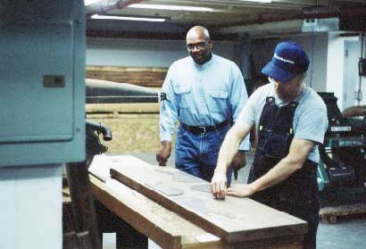 Melvin watches Rich as he lays out Body Wings for BSR 'M' and BSR 'B' Models out of a wide piece of Black Walnut.
